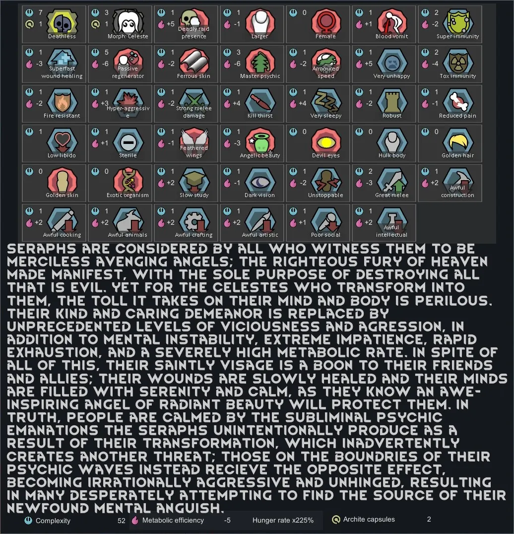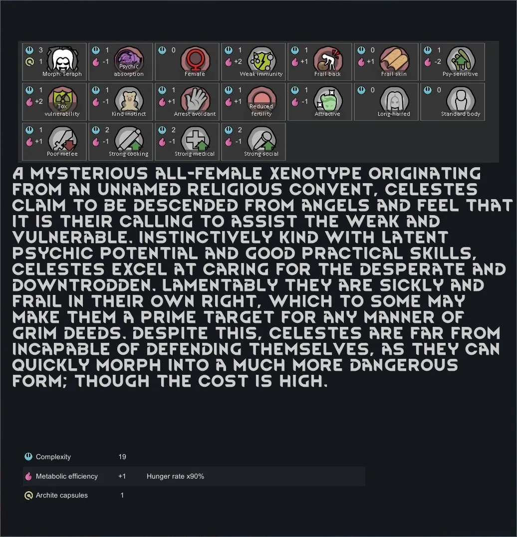 [*] Celeste/Seraph: A mysterious all-female xenotype, Celestes feel that it is their calling to assist the weak and vulnerable, but if needed, they can transform into an extremely powerful alternate form; though the cost is high.