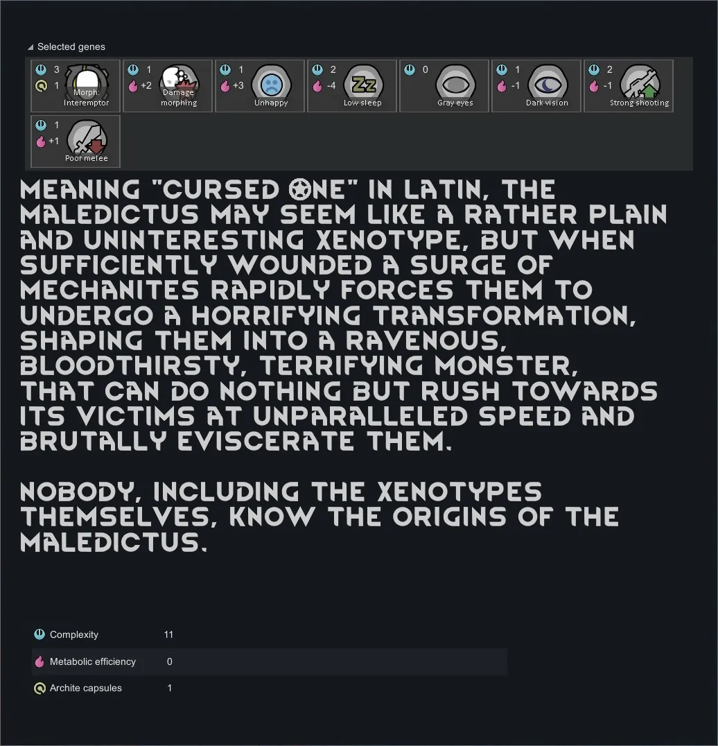 [*] Maledictus/Interemptor: The Maledictus may seem like a rather plain and uninteresting xenotype, but when sufficiently wounded a surge of mechanites rapidly forces them to undergo a horrifying transformation...