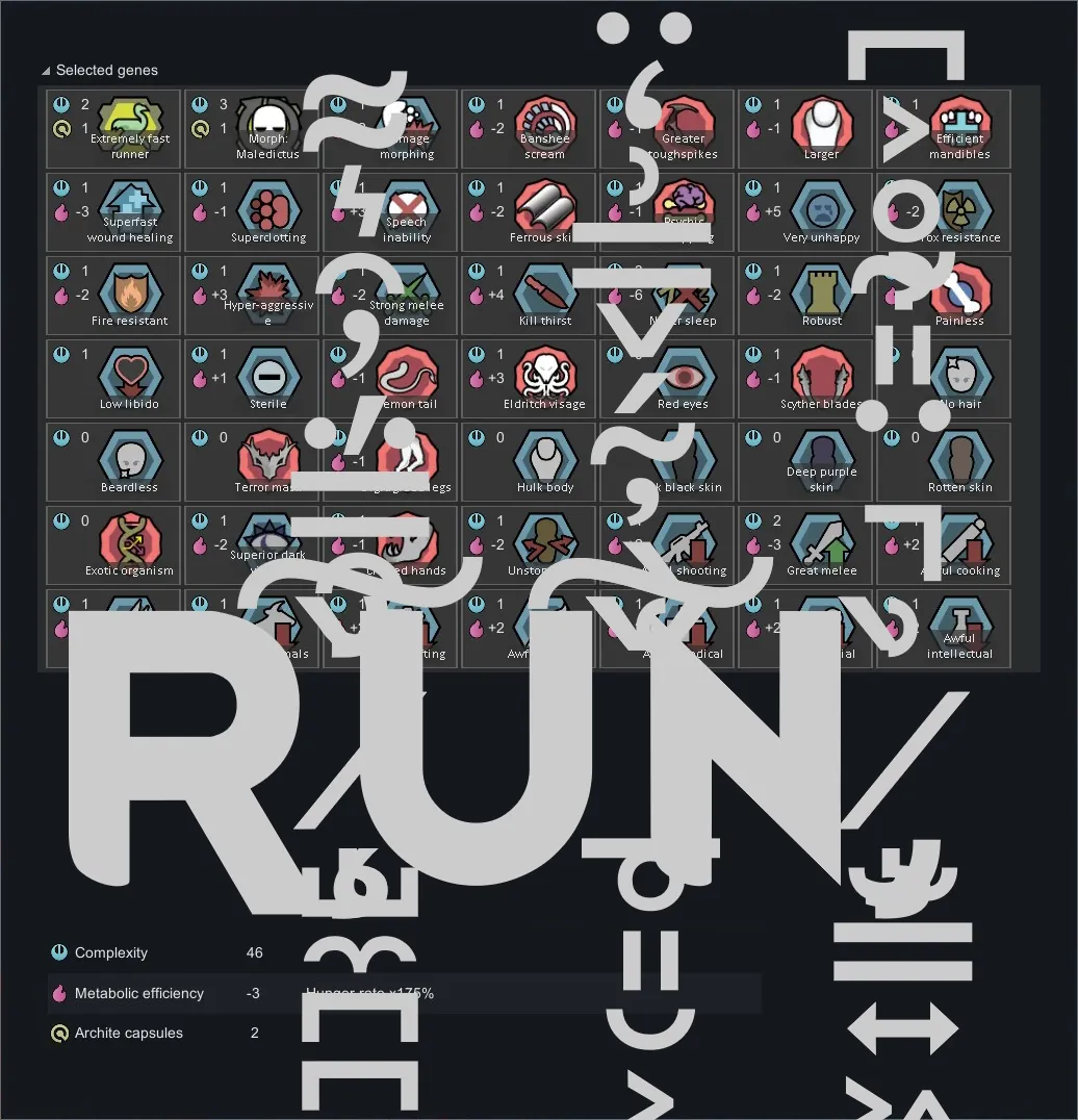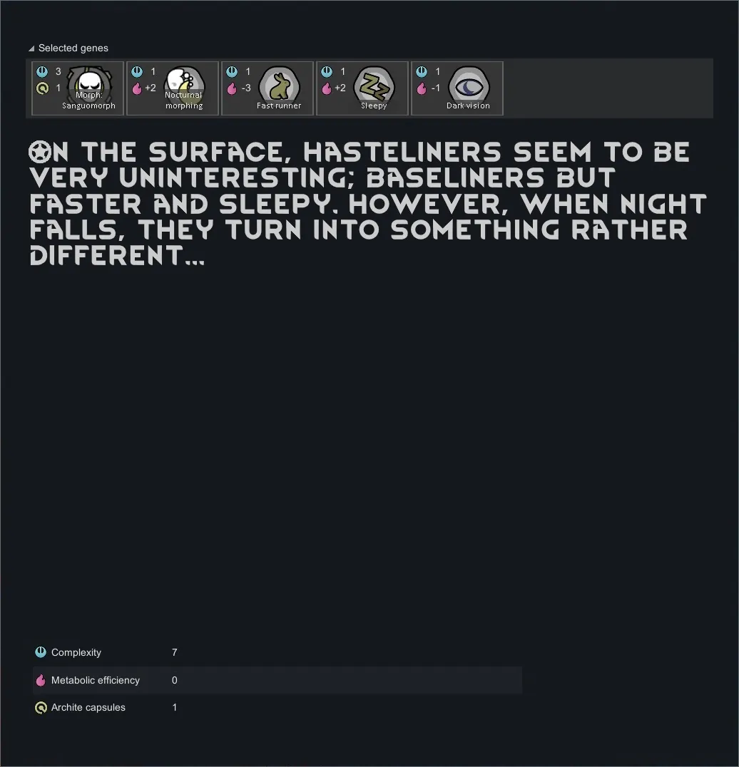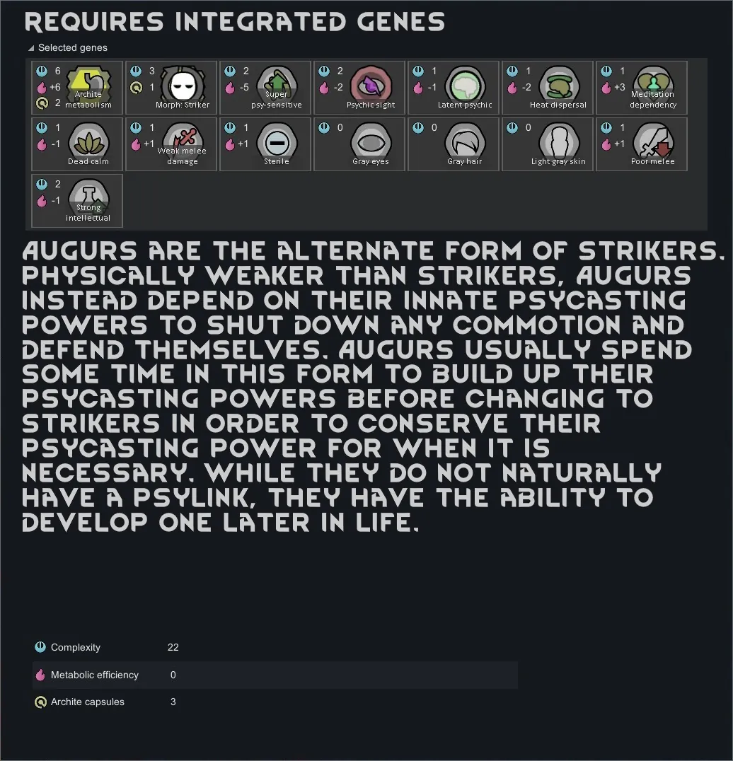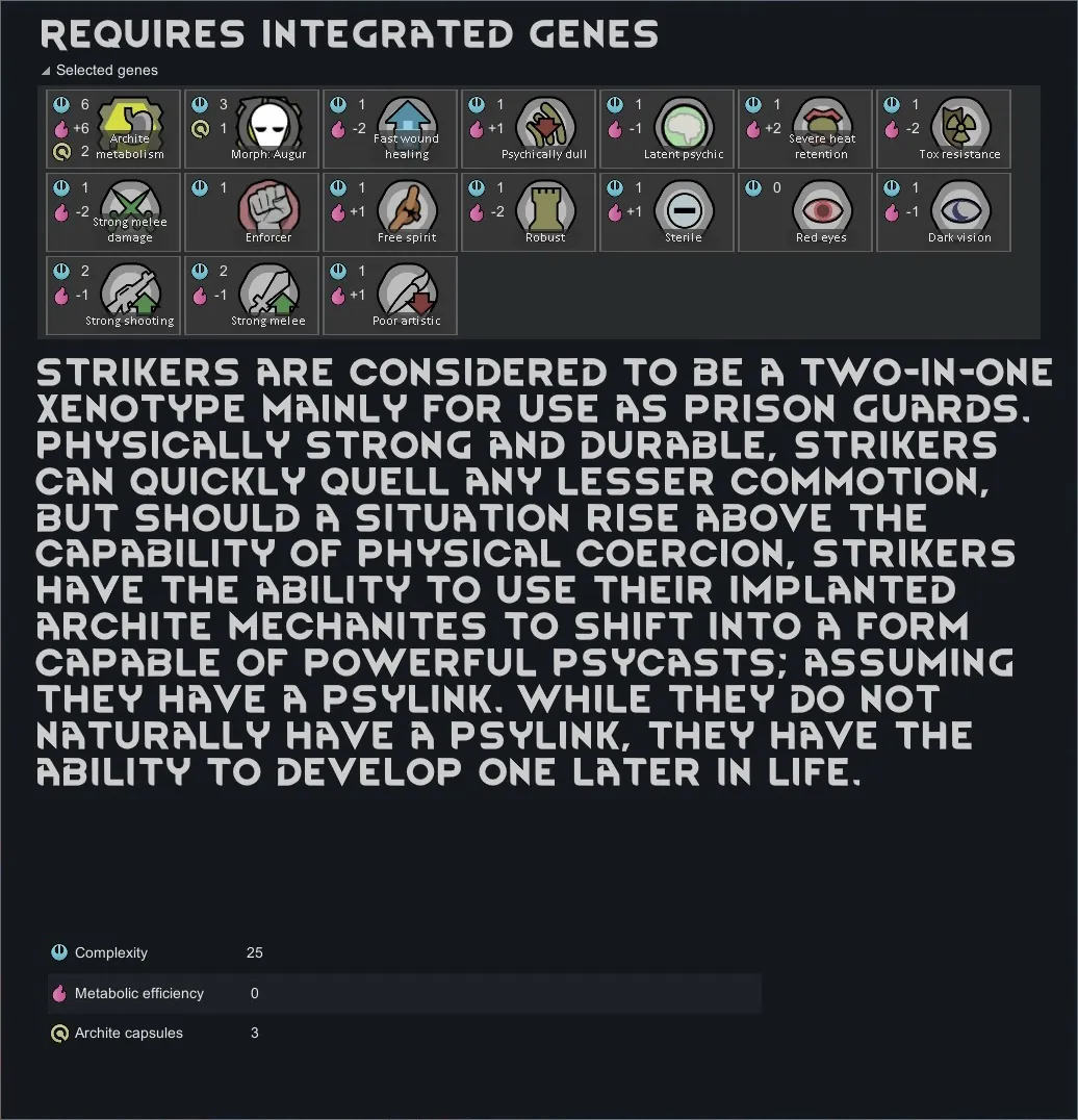 *I intended for the Striker/Augur xenotype to have Alpha Genes' Integrated Psylink, but unfortunately it resets their psylink level whenever they change forms, so I went with Integrated Genes' Latent Psychic gene instead.