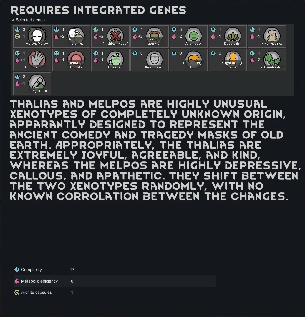 [*] This mod assumes you are starting in the default starting month of Aprimay at the default starting time of 6am (or whenever morning is). If not, some issues with morphing xenotypes may occur.