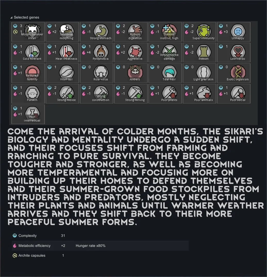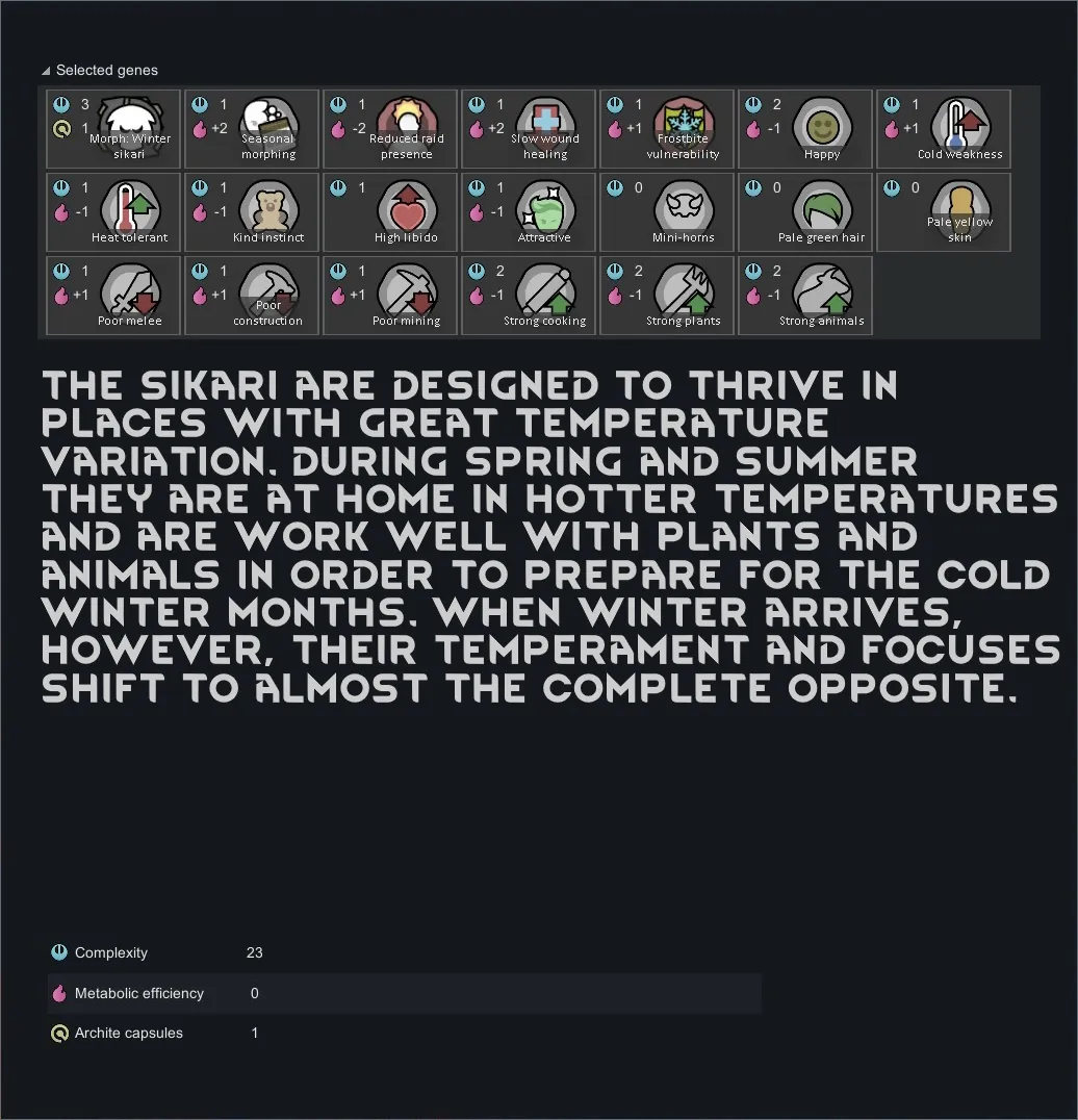 [*] Summer Sikari/Winter Sikari: With summer and winter variants, these xenotypes change their forms depending on the season, with different forms having different skills and focuses.