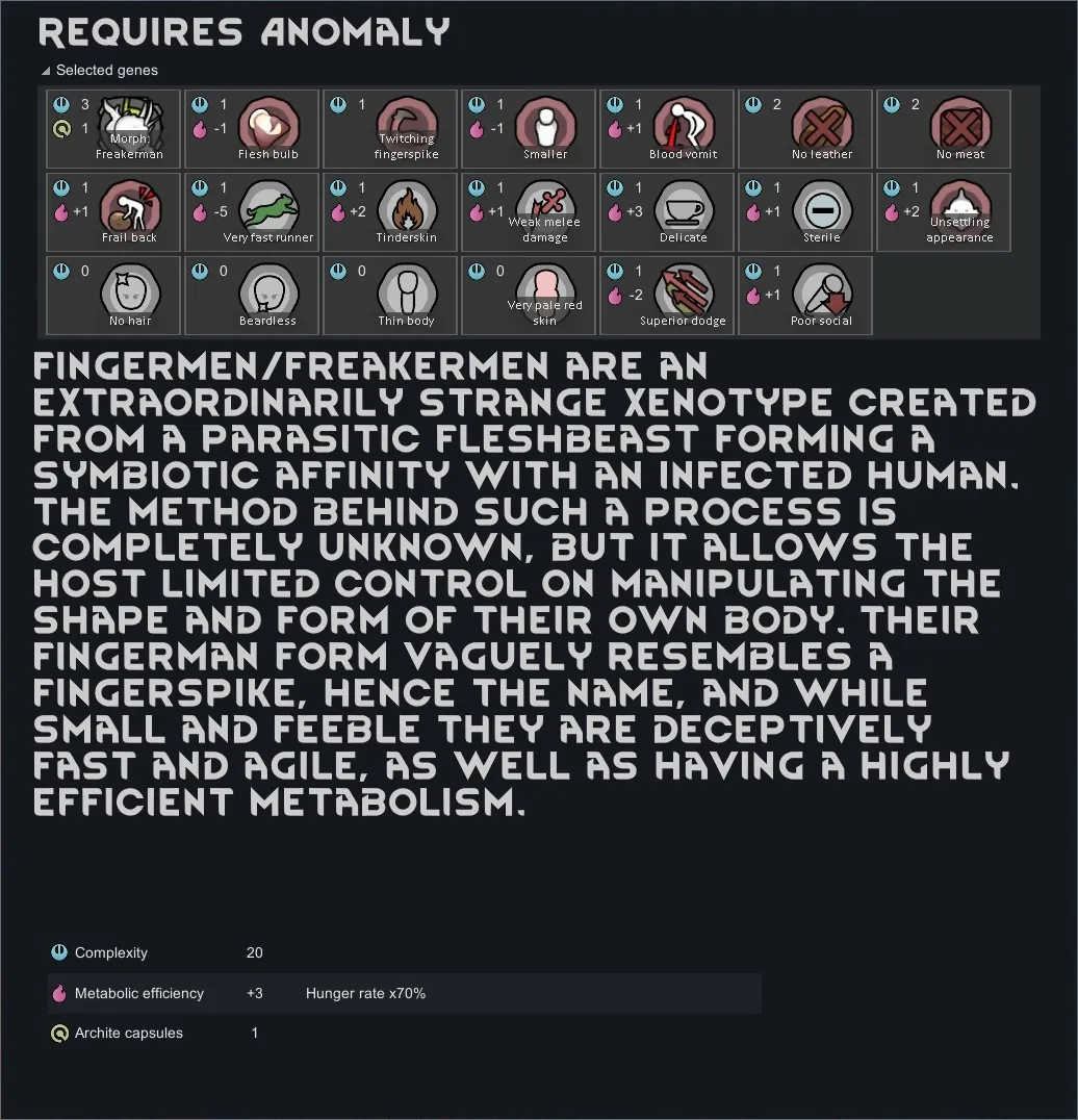 [*] Fingerman/Freakerman: An extraordinarily strange xenotype with limited control over the shape of their own body, Fingermen are exceptionally fast and agile with an efficient metabolism, whereas Freakermen are much more adept at combat.