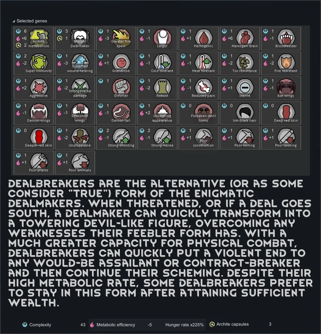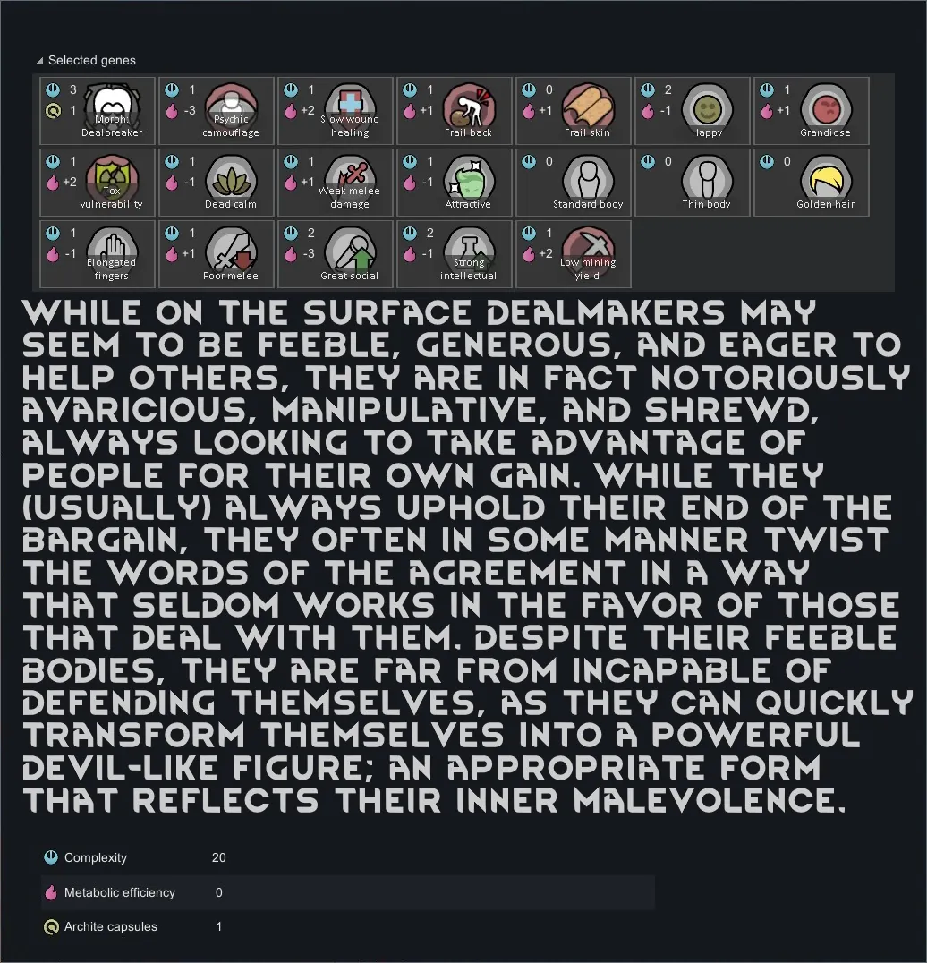 [*] Dealmaker/Dealbreaker: These charistmatic and shrewd xenotypes may appear to be well-meaning on the surface, but they can transform at will into a much more dangerous demon-like xenotype at will.