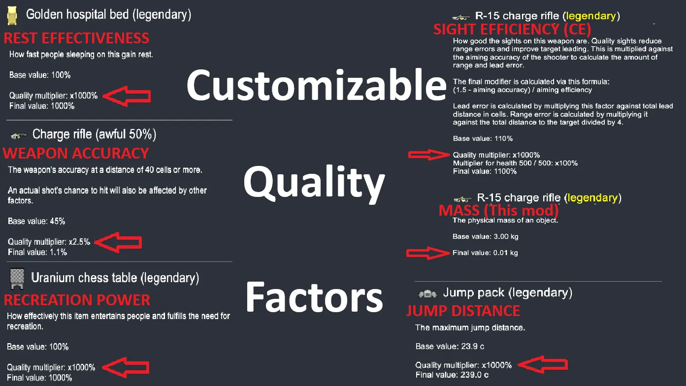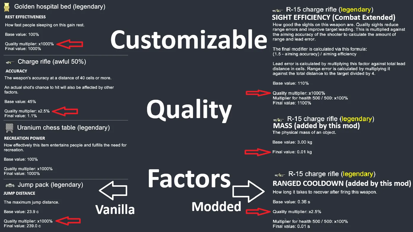 See 2nd picture for Vanilla (+ this mod) list of customizable quality factors