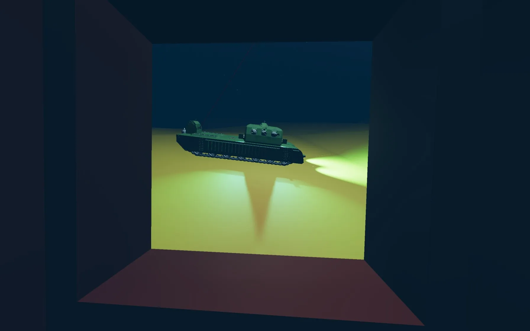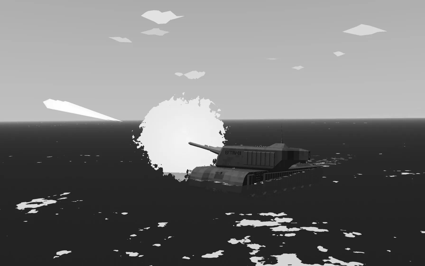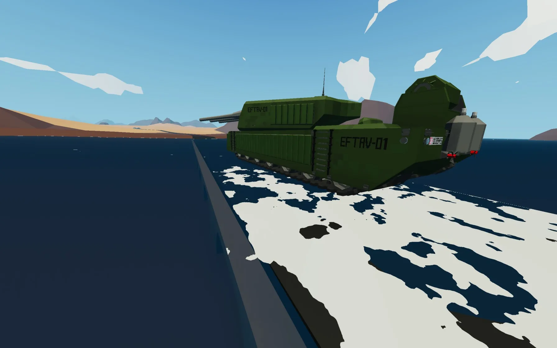And here I present to you, after many long nights of work, my baby the EFT-AV. The EFT-AV is an extremely versatile armoured vehicle, that was born as a cheap, versatile and efficient sub-hunter that could eventually fight land and surface targets. Armed with 3 380mm cannons straight out from a museum, it has 40~ shells per cannon, vertical stabiliser, manually adjustable trim, a huge 8 cylinder boxer engine, great land and water agility, it can both float, submerge and walk on the sea floor.