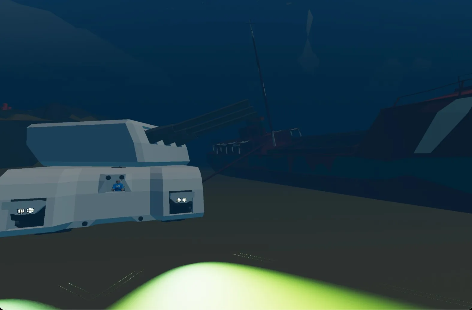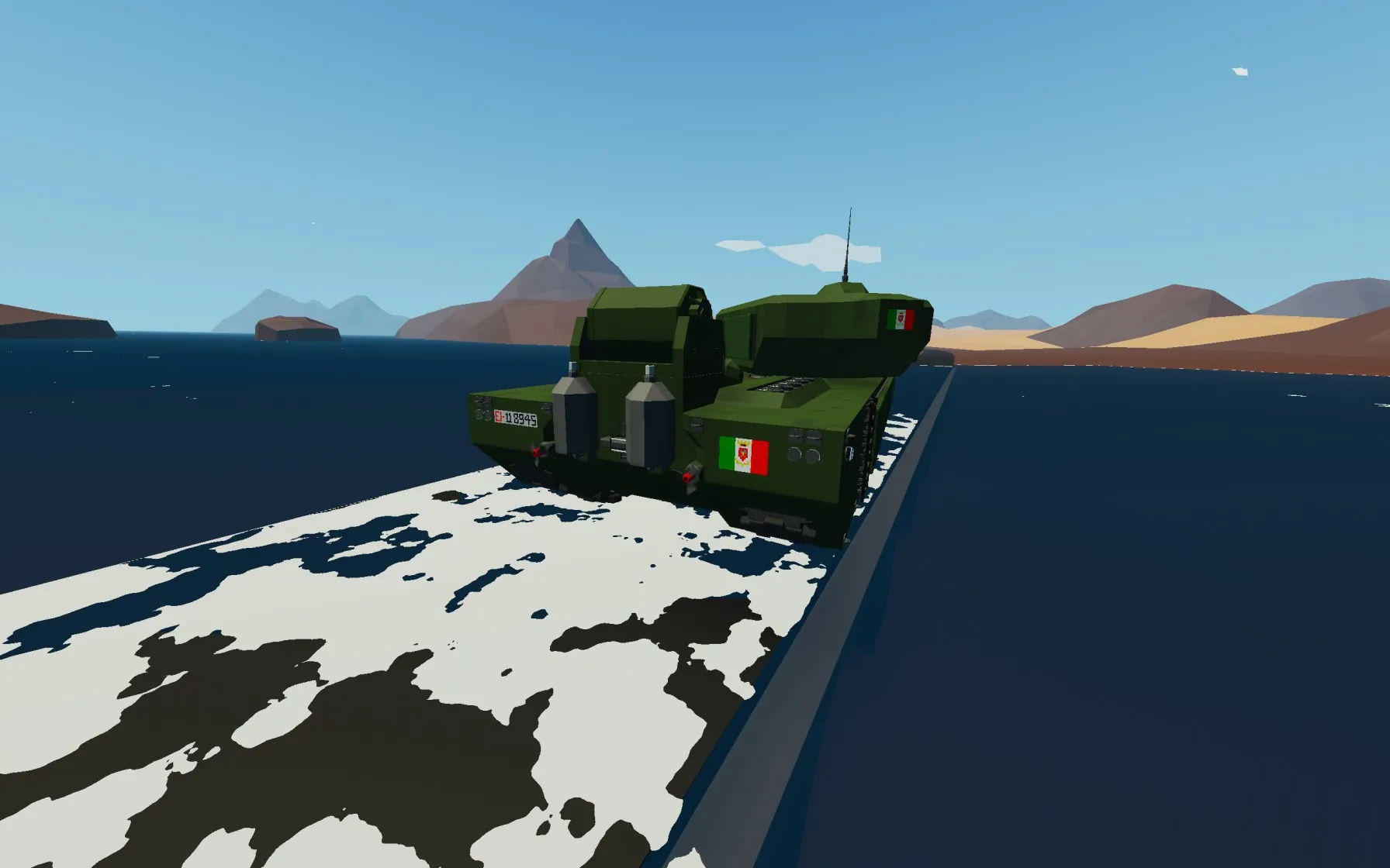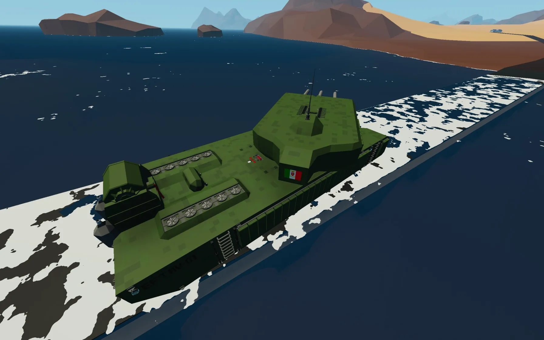 And here I present to you, after many long nights of work, my baby the EFT-AV. The EFT-AV is an extremely versatile armoured vehicle, that was born as a cheap, versatile and efficient sub-hunter that could eventually fight land and surface targets. Armed with 3 380mm cannons straight out from a museum, it has 40~ shells per cannon, vertical stabiliser, manually adjustable trim, a huge 8 cylinder boxer engine, great land and water agility, it can both float, submerge and walk on the sea floor.