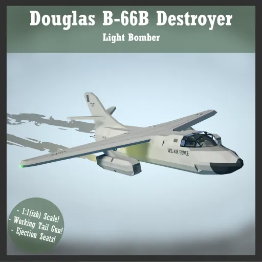 The B-66 is a lesser-known American light bomber from the cold war years. This variant, the B-model, is the bomber variant of the Destroyer, and can dish out some serious punishment with its four 3,000 pound bombs. The Destroyer's true claim to fame was in its service in as an electronic warfare and reconnaissance platform, But since neither of these are possible (to my knowledge) in Stormworks, I had to settle with the bomber variant.