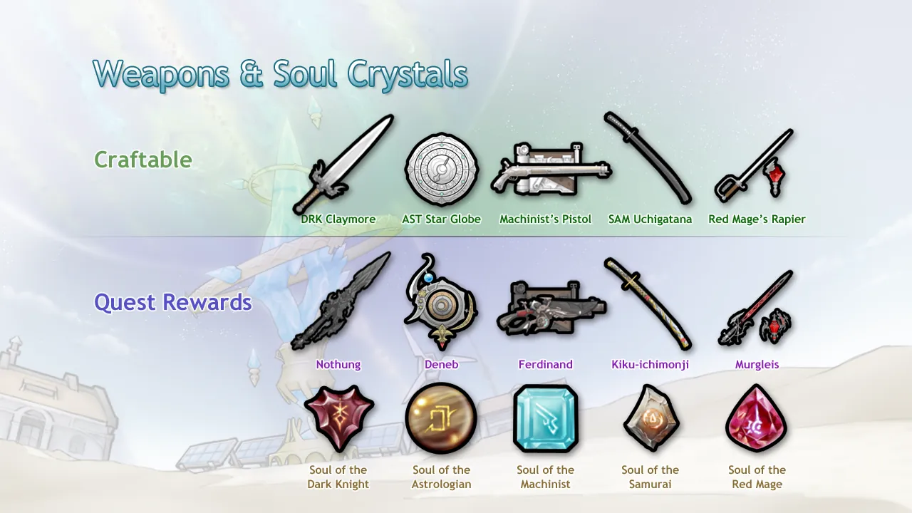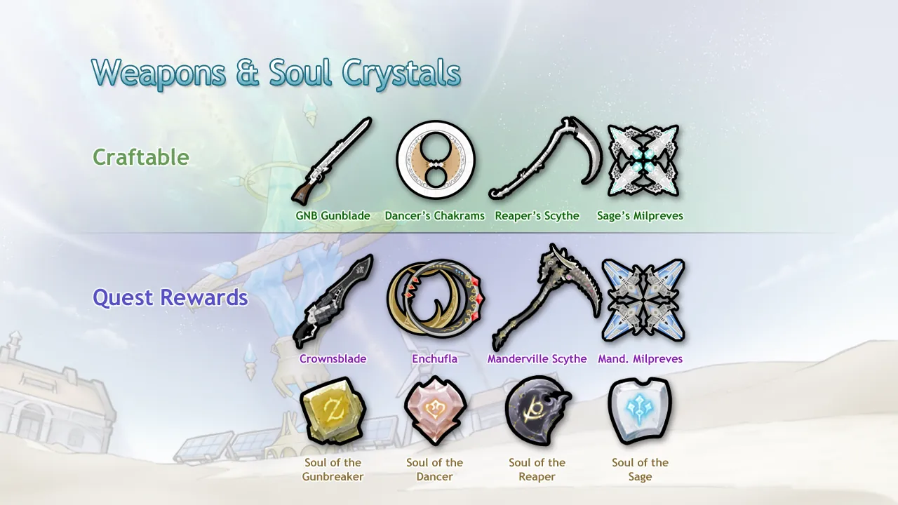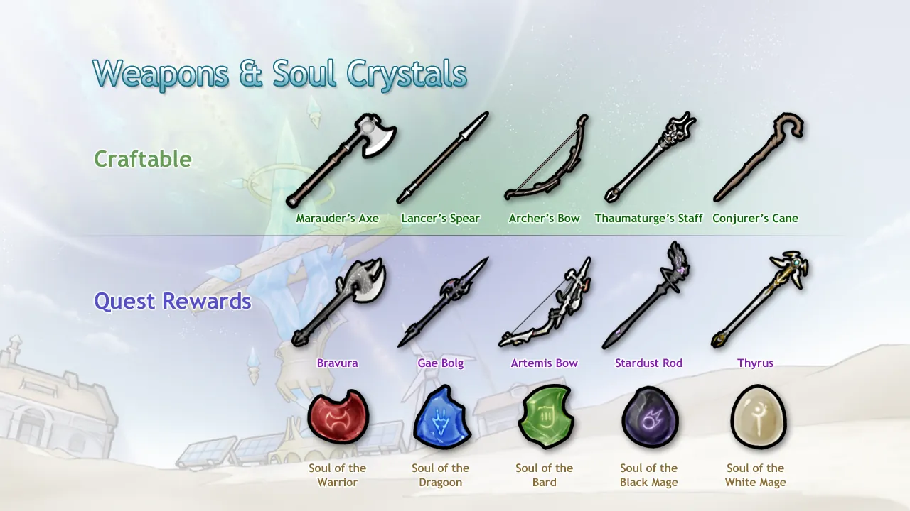 [*] Aetheric Blacksmithing - Marauder's Axe, Paladin's Arms, Dark Knight's Claymore, Gunbreaker's Gunblade, Pugilist's Fists, Rogue's Daggers, Samurai's Uchigatana, Reaper's Scythe, Dancer's Chakrams, Thaumaturge's Staff, Red Mage's Rapier, Astrologian's Star Globe