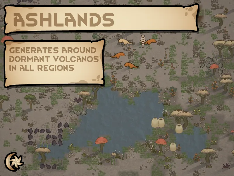 The fertile terrain of these biomes, has allowed for the formation of rather strange ecosystems. Large insects, odd-looking reptiles, and of course enormous mushroom trees are all common sights in the ashlands. Of course some ashland biomes are far more hospitable than others.