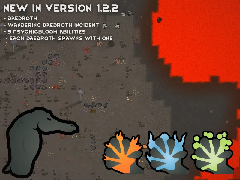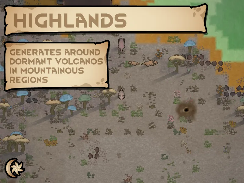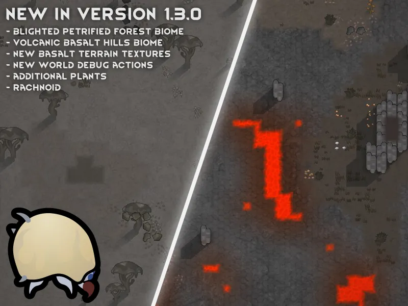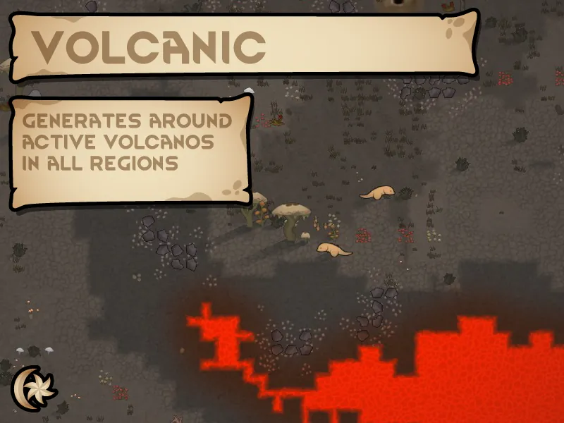 Each volcano is randomly assigned a category during world generation, which affects the maximum radius of any volcanic conditions it causes. This category can change over time, meaning your once safe settlement may not be safe forever. There are four types of volcano, each with their own associated biomes, and conditions.