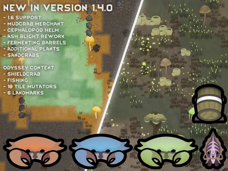 There are also several ashland specific tile mutators and landmarks added if Odyssey is enabled, as well as new fish for every ashland biome.