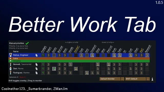 Better Work Tab is a comprehensive overhaul of RimWorld’s labor management. Reorder columns with drag-and-drop, automate priorities with smart rulesets, and organize your colonists with visual dividers. Scalable, efficient, and fully customizable.
