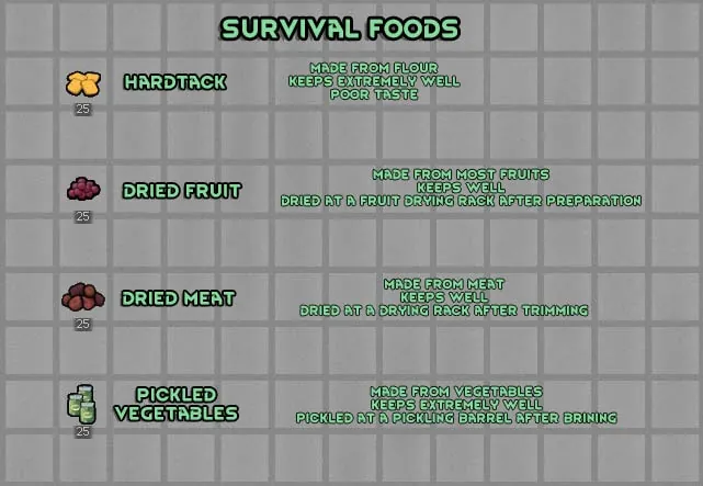 Overall, the mod is designed to be vanilla-friendly and fit seamlessly into normal gameplay without changing things up too dramatically. A secondary design focus was to improve both tribal gameplay and caravaning with the addition of a number of food-preservation techniques that don't rely on freezing temperatures or high technology.