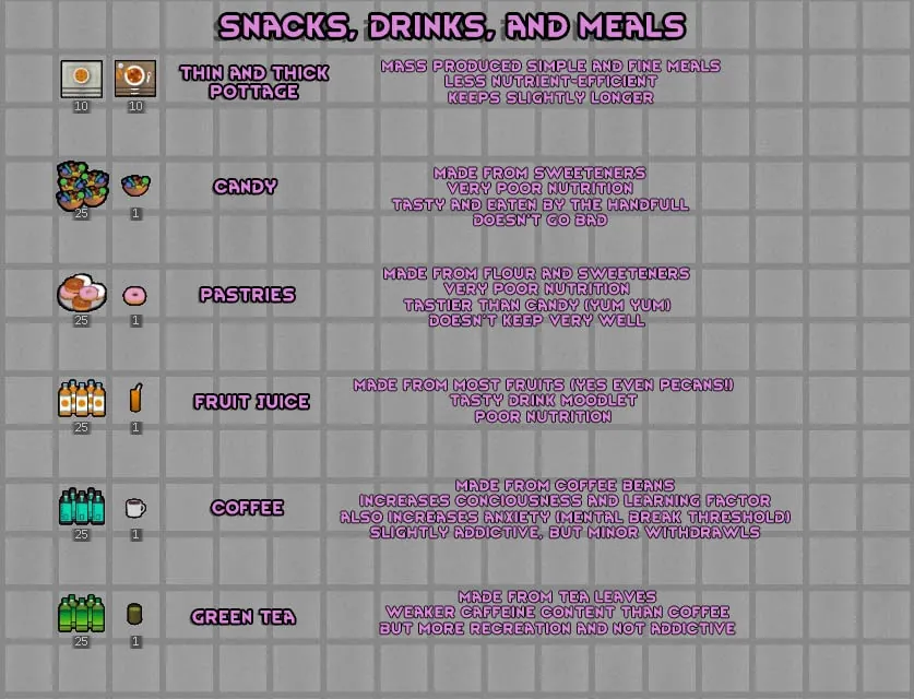 [b]New Meals:[/b] A variety of new meals including mass-produced pottage, sugary candy and pastries, as well as coffee, tea, and of course hardtack! Snacks provide their own moodlets, while coffee and tea provide pawns with a source of caffeine, boosting their productivity and learning while simultaneously boosting their anxiety. Yay caffeine-induced panic attacks!