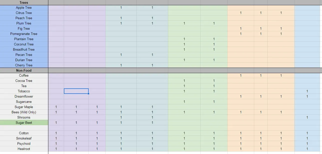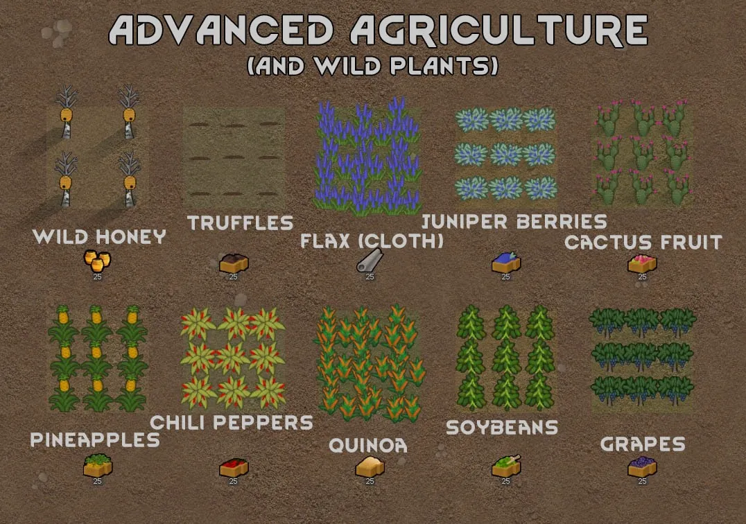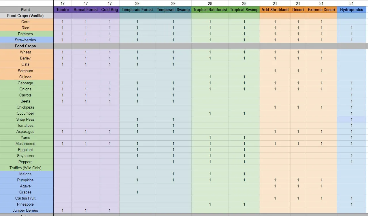 [b]New Crops:[/b] Over 40 new crops and fruit trees, ranging from tomatoes and onions to sorghum, quinoa, and grapes, all the way to cherries, pecans and durians! In addition, all new crops can only be grown in specific biomes! Vanilla crops and a few exemptions (like wheat, cabbages, and onions) can be grown in any biome, but most require one or more biomes to be grown in. Examples include sugarcane and bananas only being growable in tropical, agave, cactus fruit, and coffee only in arid, juniper berries only in colder biomes and grapes only in temperate! In addition, if the plant is growable hydroponically, it ignores these restrictions! Go ahead and hydroponically grow your tropical-climate-loving quinoa in a boreal forest, see what I care!