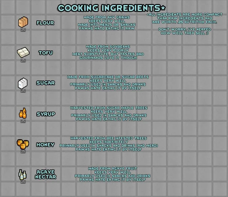 [b]New Food Categories:[/b] All foods are now organized into the five major food groups: Meat, Grains, Vegetables, Fruits, and Sweets, varying between raw and processed. Processed ingredients, such as dried fruits/meat and canned goods (found in the M&M Expansion) can be used in cooking recipes just like raw ingredients, but tend to be more space and weight-efficient. All vanilla recipes have been updated to use these new categories!