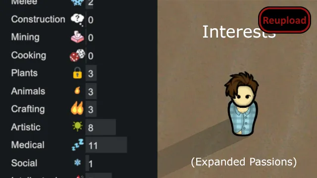 - [b]New interests[/b] (in addition to the original 3) are generated based on the initial level of the character's associated skill, the type of associated skill, whether the colonist already has an interest of that type, and certain backstory elements and traits that may force either positive or negative interests for some skills.
