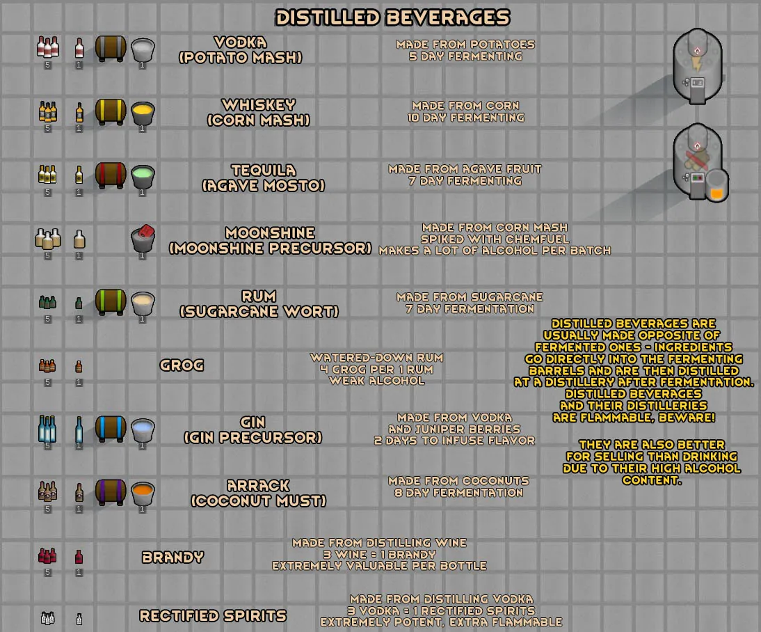 [b]Distilled Drinks:[/b] A new type of alcoholic beverage is the distilled drink! They are generally made by putting raw ingredients such as corn or potatoes in a fermenting barrel then taking the resulting product and distilling it at either an electric or fueled distillery. The resulting product is highly concentrated alcohol that is better for selling than drinking (But don’t let me stop you!). It also happens to be highly flammable.. So watch the fireworks! Some however, are made from distilling other beverages even further!