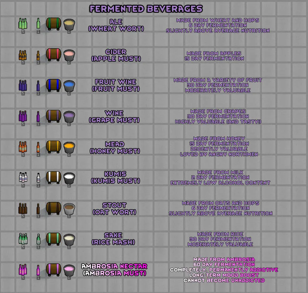 [b]Ambrosia Nectar:[/b] A special type of fermented drink, Ambrosia nectar is made from, you guessed it, Ambrosia. After turned into must at a brewery, it is then fermented in specialized casks that can only hold 5 at a time. Fermentation takes a whole year, so don’t let it spoil due to temperature! The finished product is the nectar of the gods. Ambrosia Nectar is completely, utterly, and permanently addictive similarly to Luciferium. Unlike Luciferium, it doesn’t cause them to die if they stop taking it - instead, the withdrawing pawn is permanently in a poor mood and just can’t seem to feel as much joy. Imbibing this drink puts the drinker into a 15-day ‘drunken high’ where they feel similar to being drunk without the bad side effects (No I lied, they can’t really walk straight or work well while drunk) Over this 15-day period the high slowly weakens until it goes away entirely and the pawn suffers from withdrawal effects.