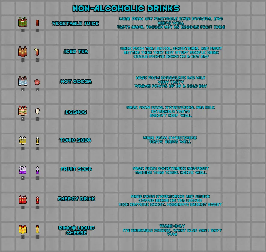 [b]New Non-Alcoholic Drinks:[/b] Iced Tea, Hot Cocoa, Energy Drinks, Fruit Soda and more! These non-alcoholic beverages are a great addition to your pawn’s recreational room and let them enjoy a number of sugary sweet drinks after a hard day of fending off the rampaging hoards of raiders, insects, and mechanoids.