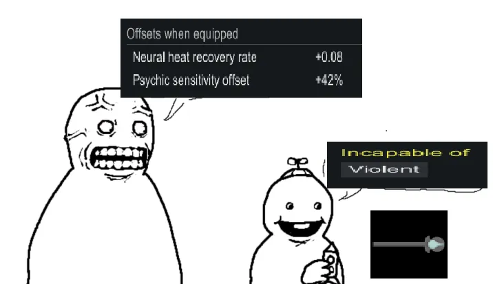 Does your pawn have 5 different psycasts to instantly kill someone, but refuses to hold an eltex staff because they "refuse to do violence"? Or does your pawn with 20 plants refuse to hold a shovel for that +5% harvest yield? If so, then this mod is for you. This mod allows pawns incapable of violence to be able to equip anything any other pawn can. They still wont be able to use them in combat, but they will benefit from any bonuses their equipped weapon provide.