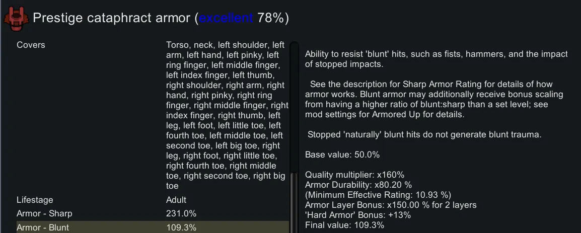Alters the armor system to use more detailed mechanics of damage and resistance, blunt trauma, and armor degradation, with dozens of configurable options. Made because I love CE's armor mechanics, and wanted a similar experience outside of CE.