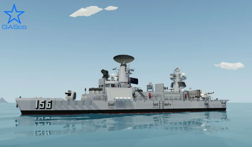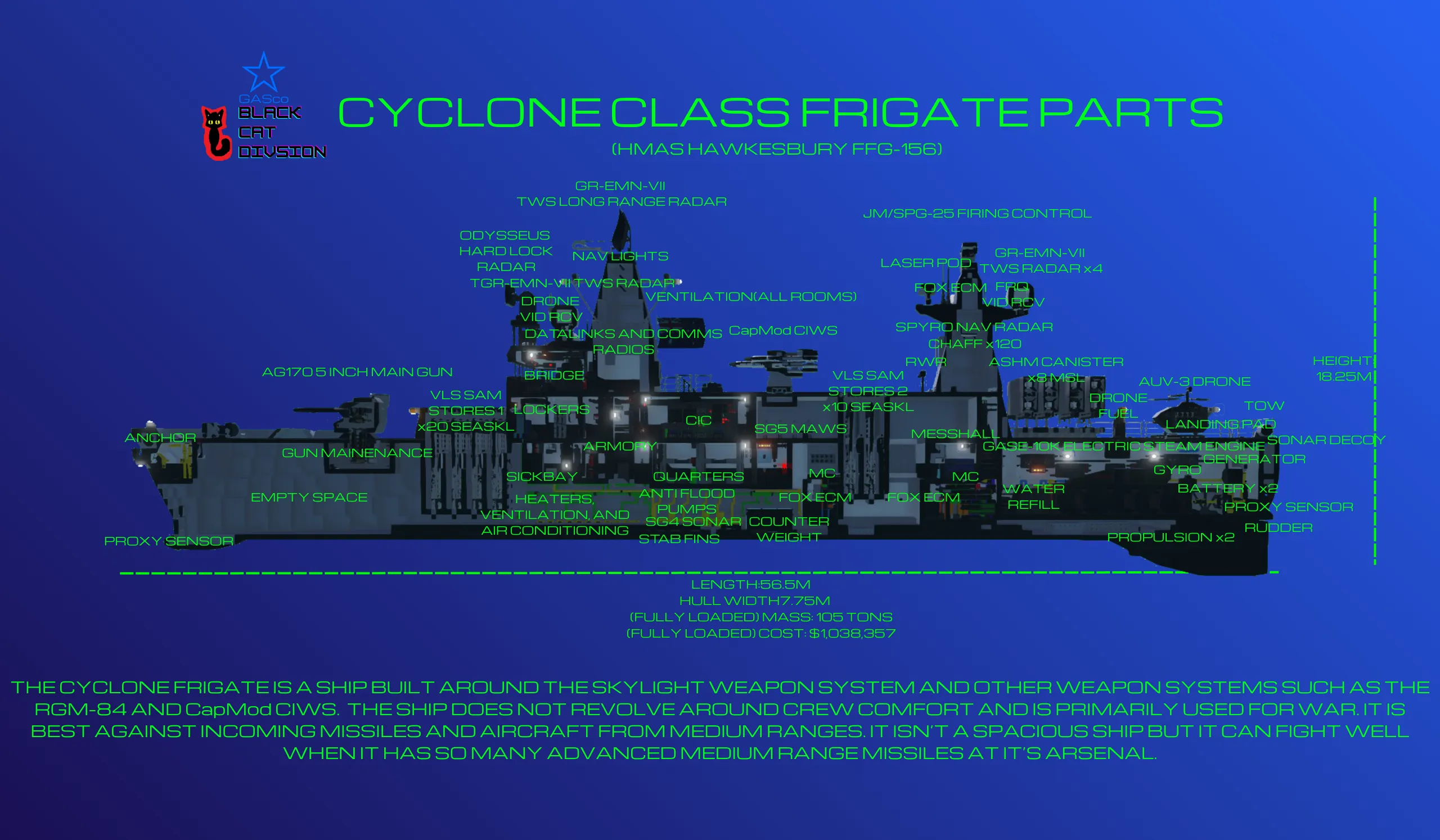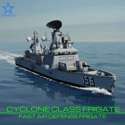 The Cyclone Class Fast Anti Air Frigate is a small modular escort frigate designed to be fast and maneuverable. Though it is has other functions such as SAR, anti-ship and reconnaissance, it's primary role is to shoot down incoming missiles to protect aircraft carriers and other large flagships. It can boast about 50 missiles total and 1 5-inch gun(battle cannon). It has no machine guns as it's primarily an anti missile frigate despite it's classification name as "anti air frigate" which it's more about intercepting missiles than aircraft. Not only that, it is also quite stable even in huge waves and strong winds as that is the requirement for patrolling all around the oceans in the world. It is able to stay stable by having gyros, fins, and an active counterweight.