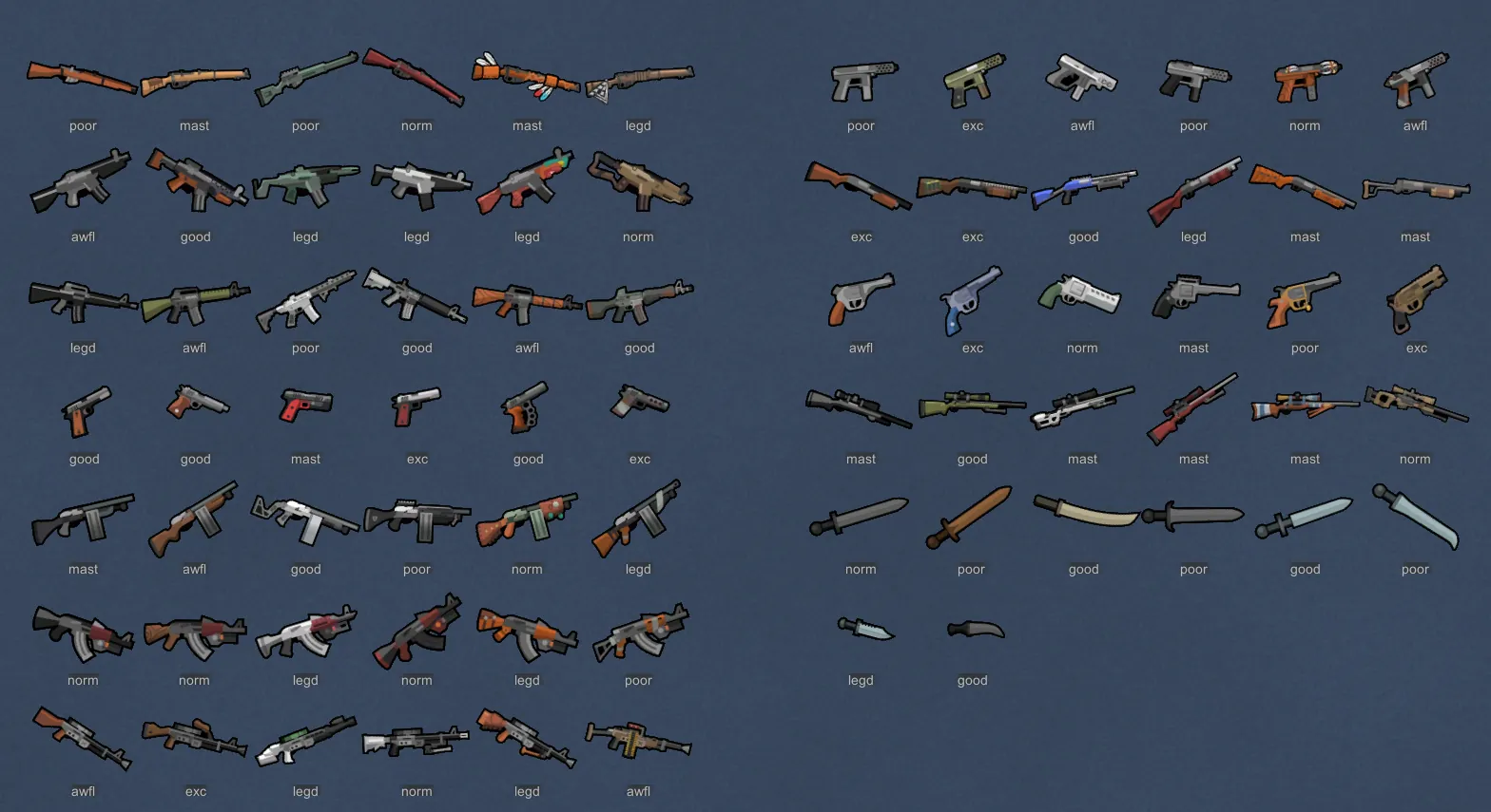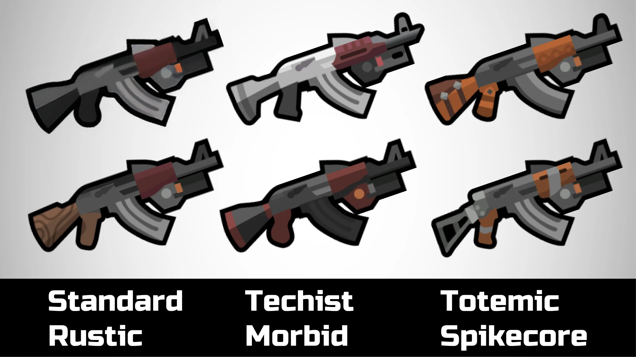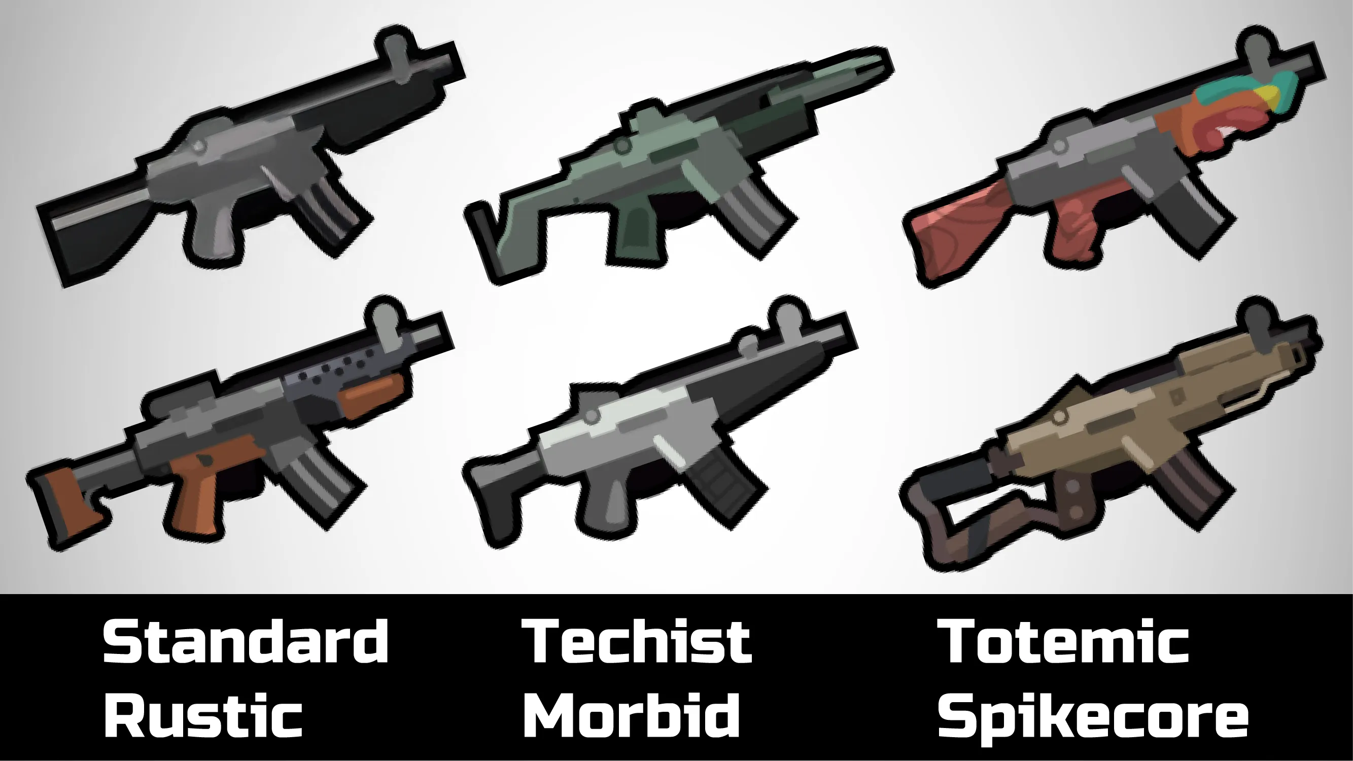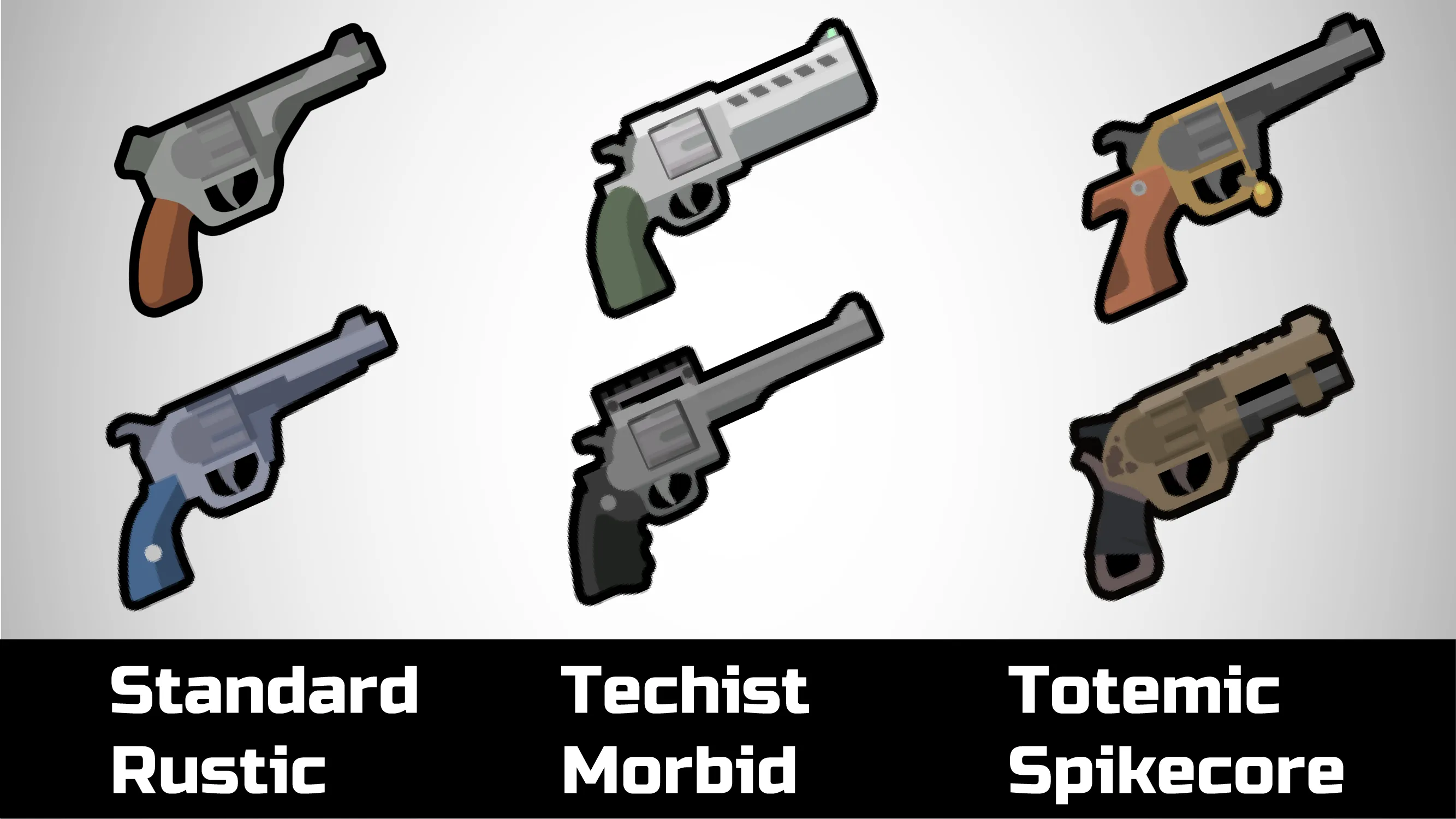 I dislike all guns being the same colors, so each style should have at least 2 main colors, while following its theme.