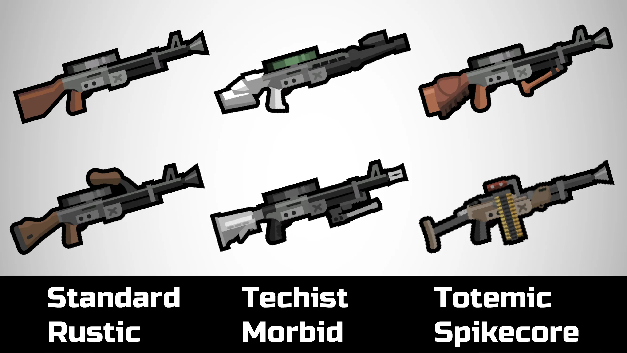 [b]Morbid[/b] weapons are stylized to be grim, intimidating and reserved. Military guns have simple, utilitarian, gray and black paintjobs, while more exotic guns have silver, red wood and brightly polished metal. Something you'd expect a vampire, cartel member or a politician to possess.