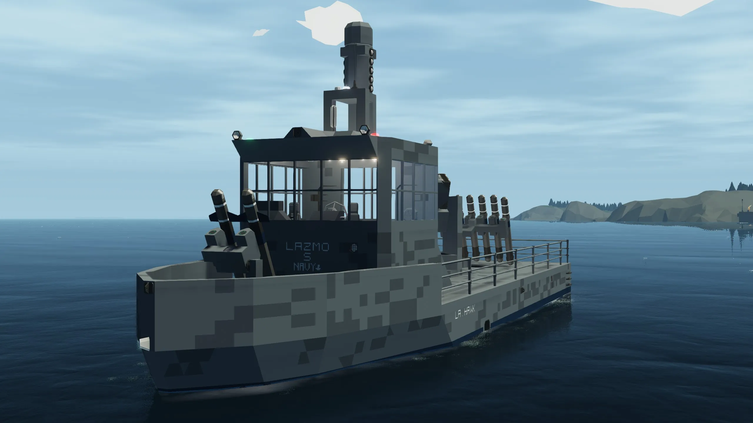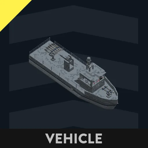 A fast Svretskan naval patrol craft built by Lazmo Maritime. The LA Hawk combines agility with precision strike capability, featuring twin RASMa (Alpha) anti-ship missiles, a LM/MRSC-2K “Orkan” manual rotary cannon, and the LA/LRQ-5K long-range radar paired with a LA/RWS-2K radar warning system. Designed for coastal defense and escort duties, the Hawk delivers rapid response against surface and aerial threats while remaining light, fast, and easy to maintain.