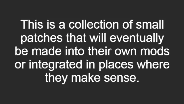 I have lots of big projects coming up that I don't know where to put some of these smaller tweaks. In my earlier workshop days, I would have made a billion tiny patch mods for them but i've shifted my philosophy a bit to these more themed larger progression mods. To not have lame Progression mod spam, i've decided to put work that I want done for my modpack in this mod to allow for certain mods to be where I need them to be without having to release mediocre patch collections. I'm also wrapping on the grand Medieval Overhaul integration project, and i'd love to get some final stuff out of the way fast.