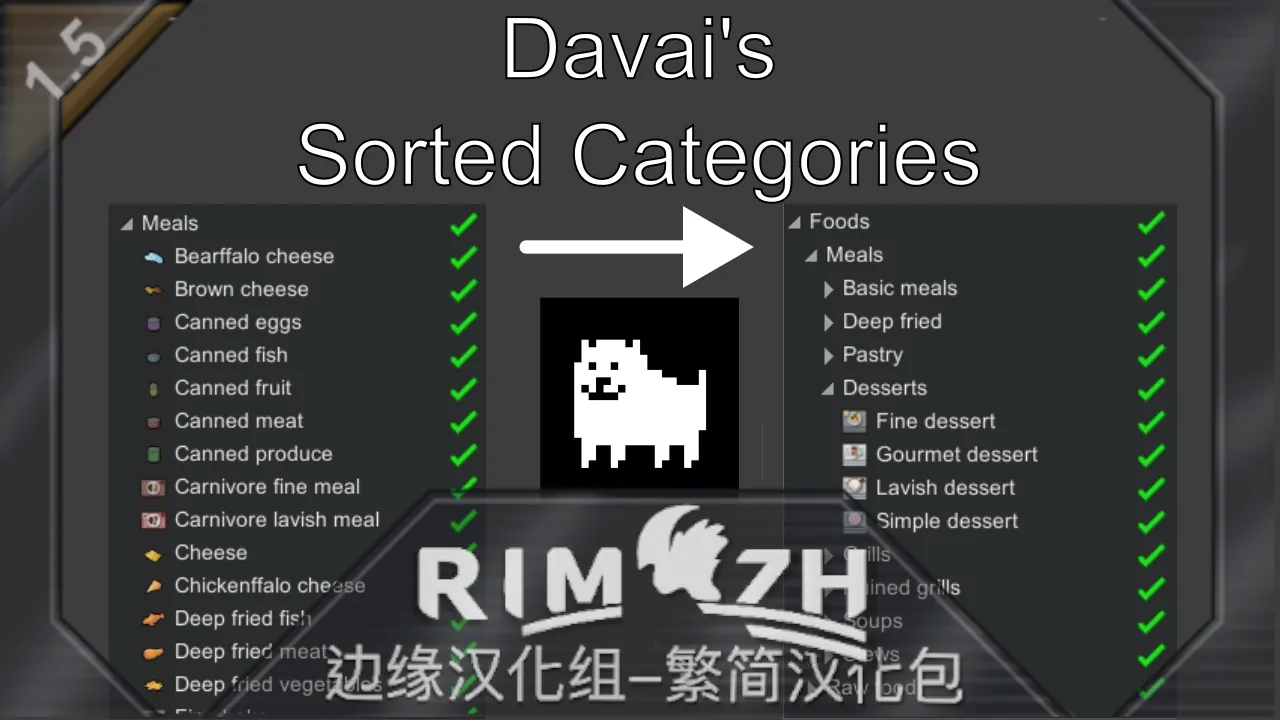 This is a Chinese localization of [url=https://steamcommunity.com/sharedfiles/filedetails/?id=3419053173]Davai's Sorted Categories[/url] by [url=https://steamcommunity.com/id/smolldoggi]Davai[/url], please subscribe the original mod.