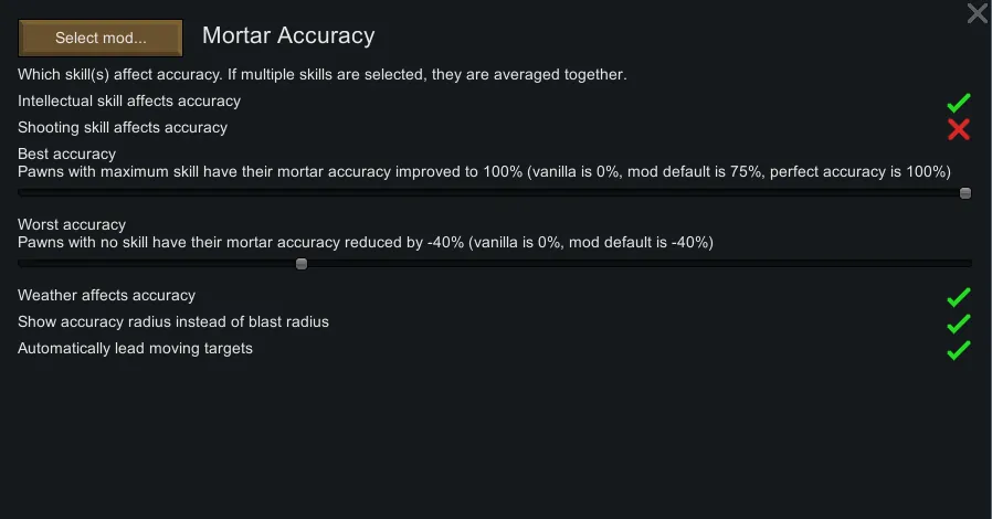 A: Vanilla mortar accuracy is only modified by shooting skill. This mod adds more features and options