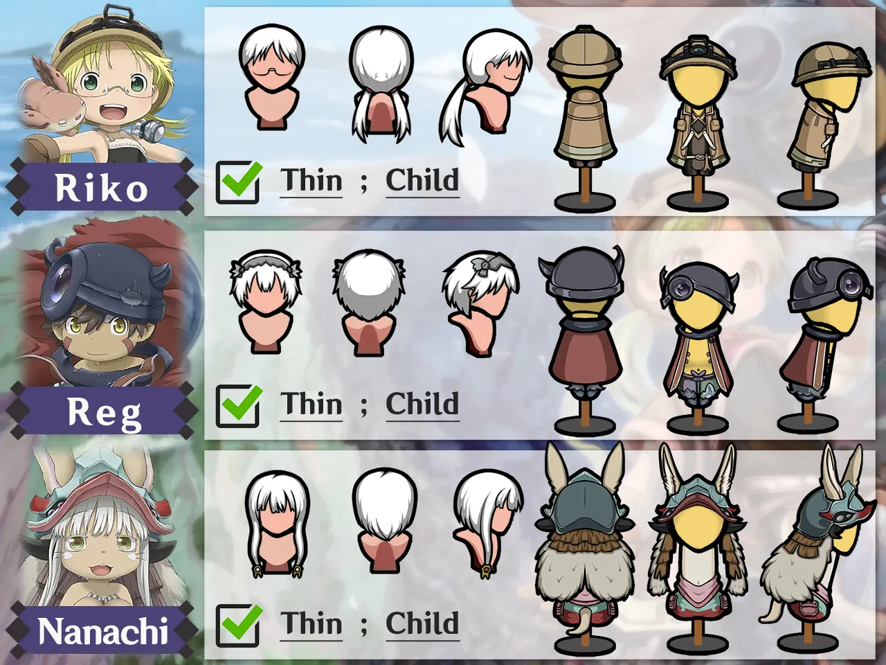 以动漫作品《来自深渊》里三位主角为原型的角色包,包括衣服,发饰和帽子(仅含Thin和儿童体型)