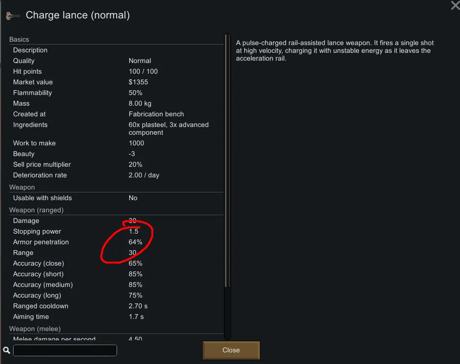 Modded Charge Lance starts to beat Charge Rifle at about 110% armor, according to my rimworld combat simulation DPS calculator program (images 2-4). A good quality lance should have higher dps against 110 armor than even excellent charge rifle.