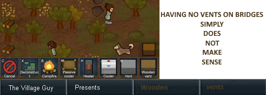 A wooden vent for equalizing the temperature between two rooms without allowing people to walk between them. Can be placed on bridges.