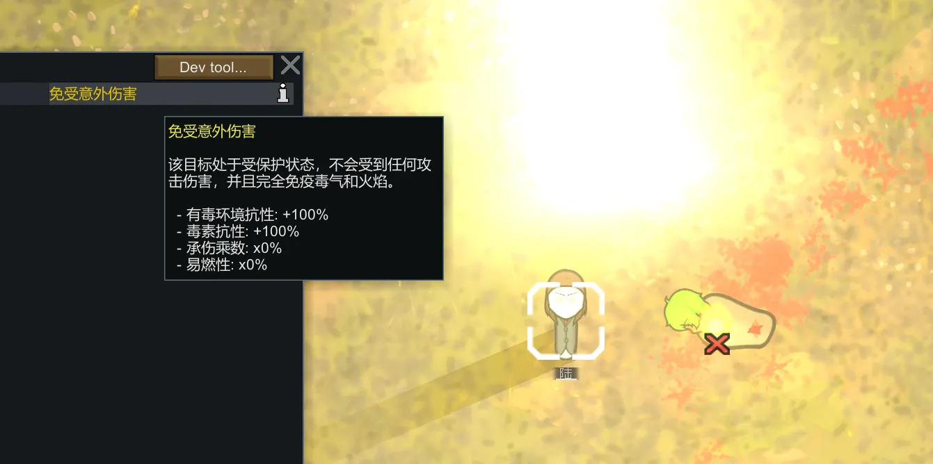 一个简单的模组,添加了一个名为 “免受意外伤害” 的健康状态,你可以通过开发者模式或者Character Editor添加它到任意目标上。