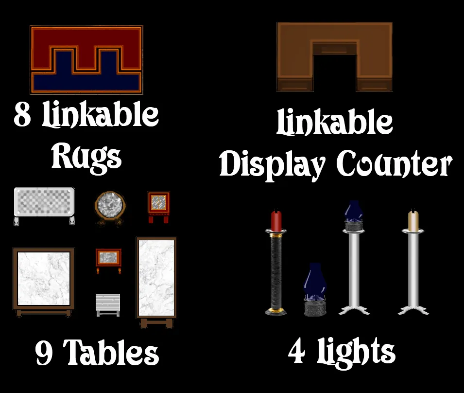 The linkable rugs and display counter may try to link with similar objects from other mods. For reference, their link tags are Custom1-9. They'll try to link with anything that shares the same tag.