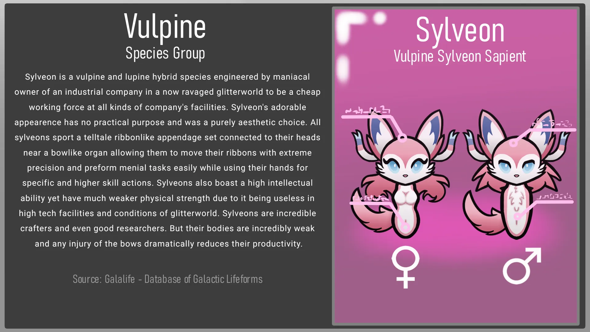 Sylveon is a Vulpine and Lupine hybrid species engineered by maniacal owner of an industrial company in a now ravaged glitterworld to be a cheap working force at all kinds of company's facilities. Sylveon's adorable appearence has no practical purpose and was a purely aesthetic choice. All sylveons sport a telltale ribbonlike appendage set connected to their heads near a bowlike organ allowing them to move their ribbons with extreme precision and preform menial tasks easily while using their hands for specific and higher skill actions. Sylveons also boast a high intellectual ability yet have much weaker physical strength due to it being useless in high tech facilities and conditions of glitterworld. Sylveons are incredible crafters and even good researchers. But their bodies are incredibly weak and any injury of the bows dramatically reduces their productivity.