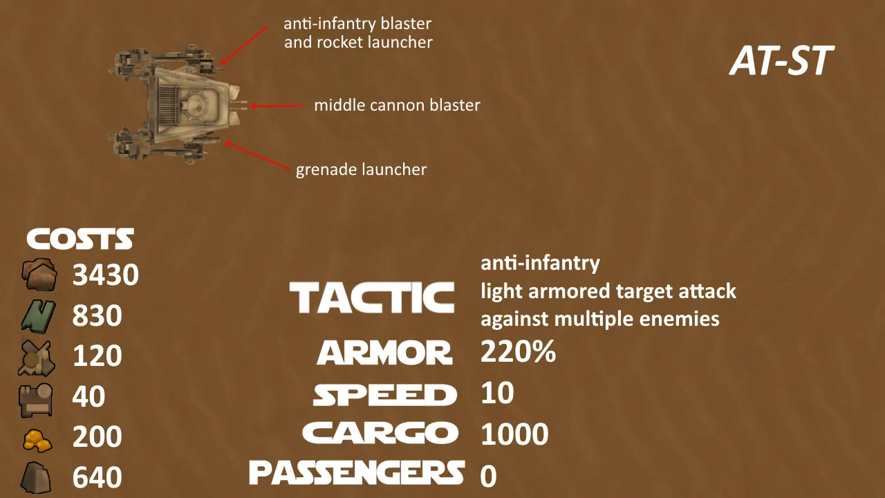 The ATST is a walker that stands approximately 7.4 meters tall. It is equipped with a dual laser cannon mounted on its chin, as well as twin medium blaster cannons and a concussion grenade launcher. The ATST’s primary Function is to patrol and scout in difficult terrain, using its long legs to traverse obstacles and its elevated position to provide a clear field of view. It is also heavily armored and can withstand a considerable amount of firepower.