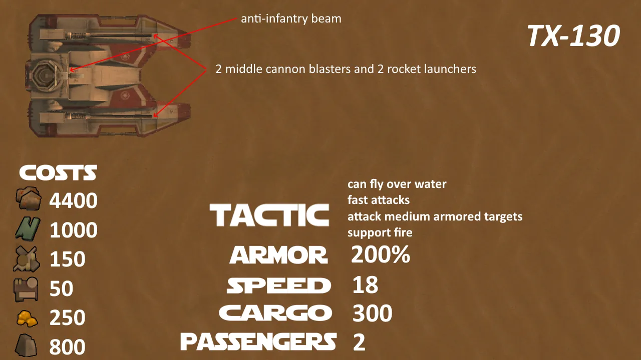 The TX-130 tank was designed to provide infantry support, engage light enemy armor, and escort allied forces. TX-130 used for anti-armor and anti-fortification roles with their heavier armament. The TX-130 was designed with the tactical flexibility of a starfighter, making it swift and agile.