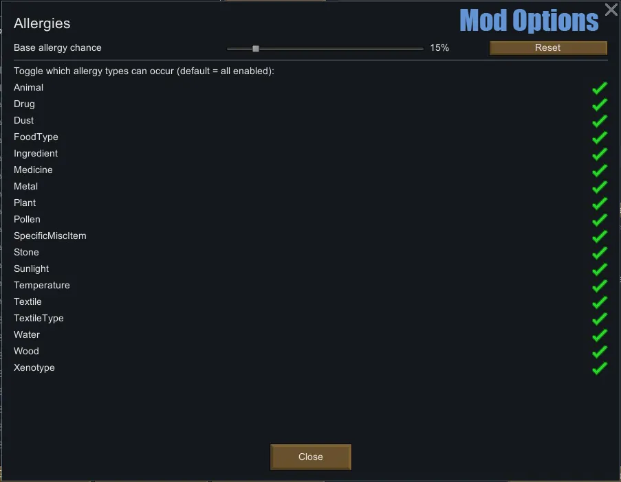 Allergies come in many shapes and forms, with different effects and gameplay implications. Be aware that this mod adds a whole new system of allergy types, triggers, exposure mechanics, allergic reactions, and treatment options, not just a simple "allergy disease".