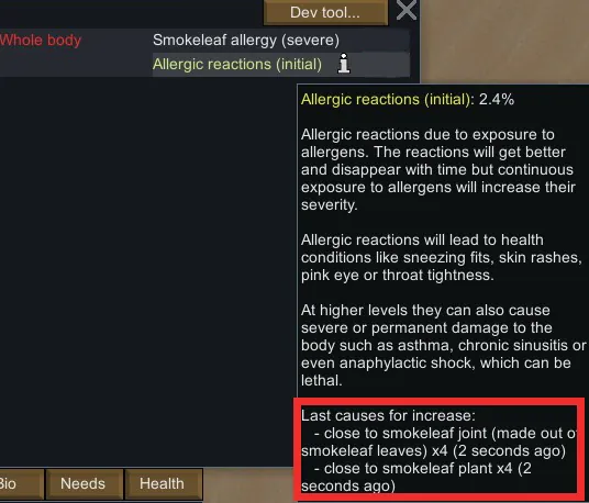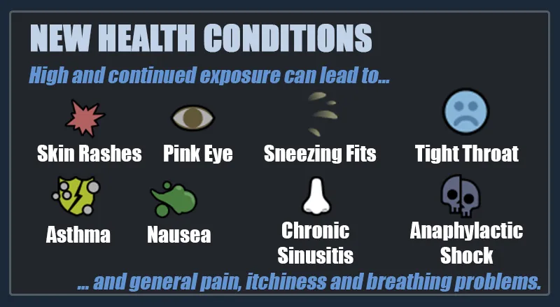 Allergic reactions are mildly unpleasant at first, but can lead to permanent and severe damage in later stages. On a base level allergic reactions cause general issues such as increased pain and rest fall rate, and reduced mood, breathing and working speed. But the higher the stage of allergic reactions, the higher chance of developing additional health conditions: