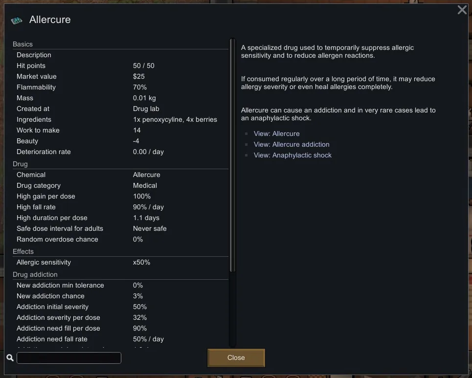 [*] [b]Allercure:[/b] A specialized drug used to temporarily suppress allergic sensitivity and to reduce allergen reactions. If consumed regularly over a long period of time, it may reduce allergy severity or even heal allergies completely.