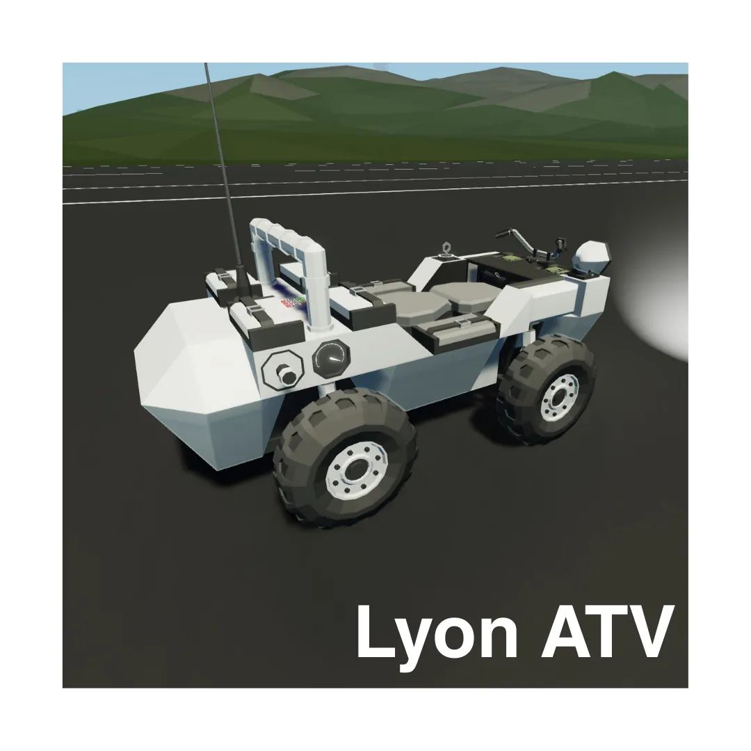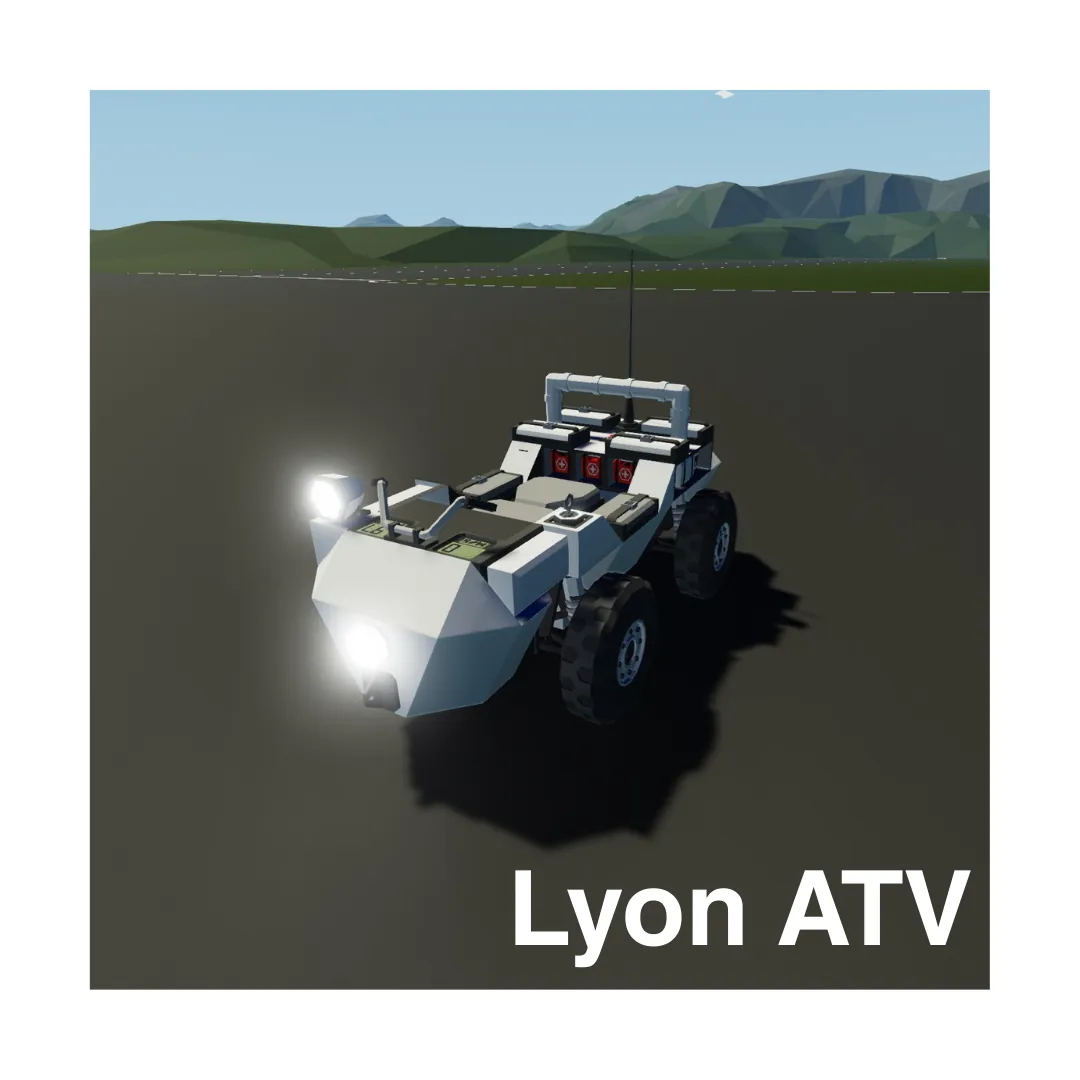 The Lyon E-ATV cruises at 30m/s, or 108km/h, carries 8 people, including the driver, and holds 2 First Aid Kits, 1 Flashlight, 1 Rope and 1 Fire Extinguisher. It also has a listen-only Radio for up to 1km of range to monitoring a frequency.