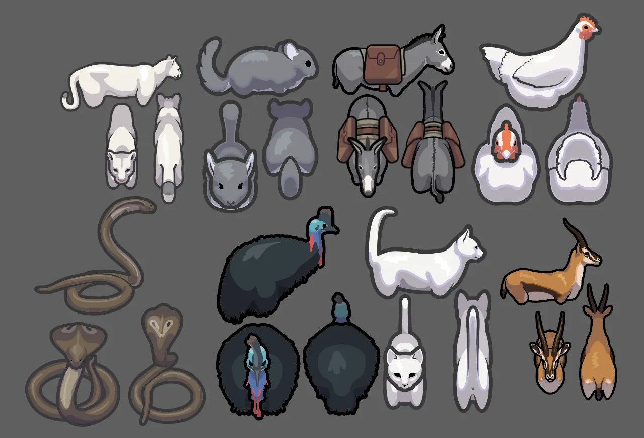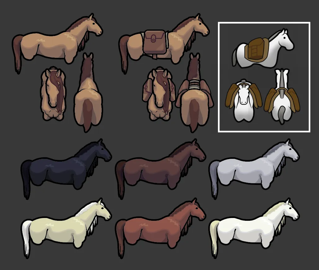 Hand-Drawn Textures for nearly all non-flying vanilla animals and their saddles, as well as many [url=https://steamcommunity.com/sharedfiles/filedetails/?id=1511926373]Animal Variety Coats[/url] (as well as the Fox Patch) and [url=https://steamcommunity.com/sharedfiles/filedetails/?id=3325889359]Situational Animal Graphics[/url] add-ons.
