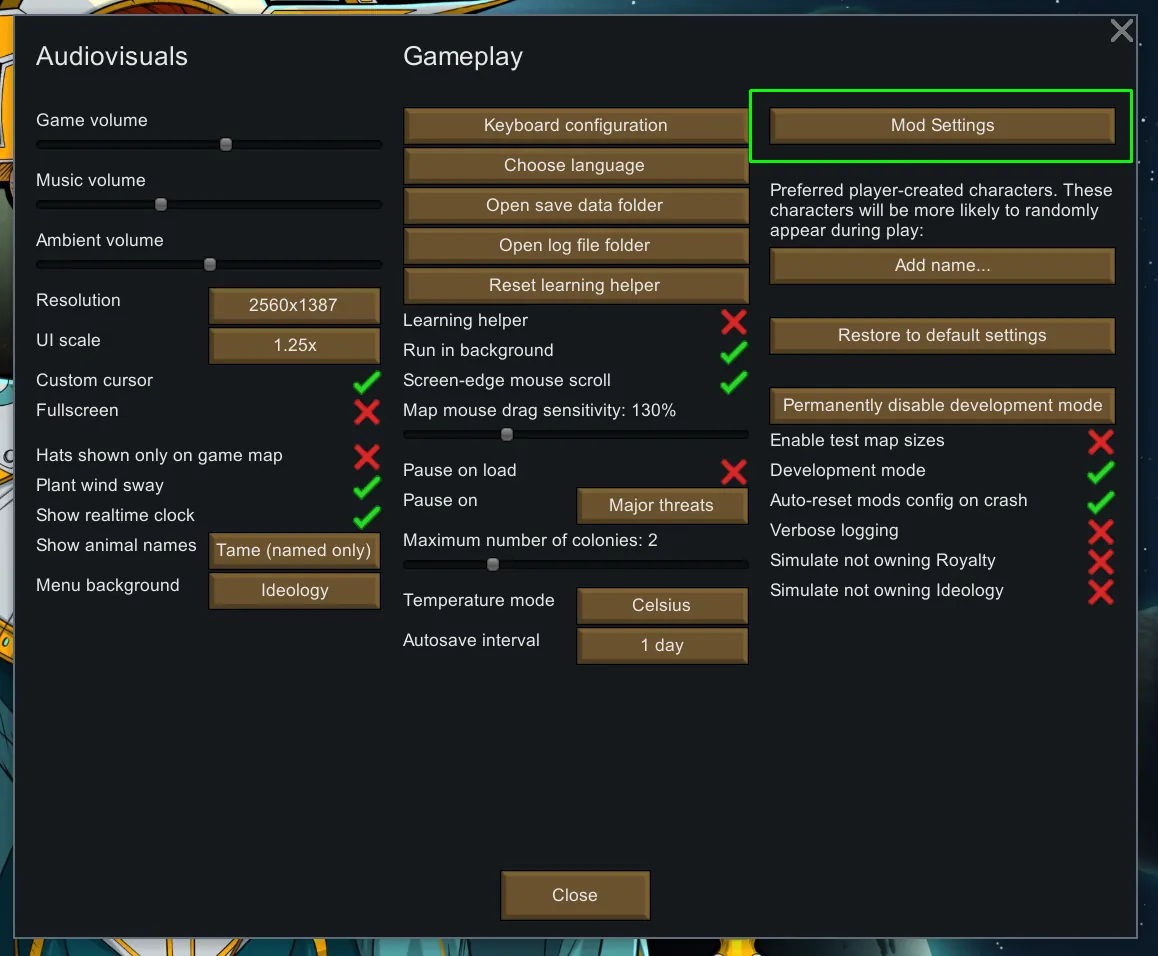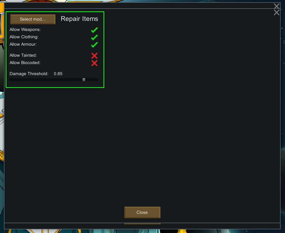 - Mod Settings page allows for choosing what to repair and when to repair it, see screenshots to find this menu.