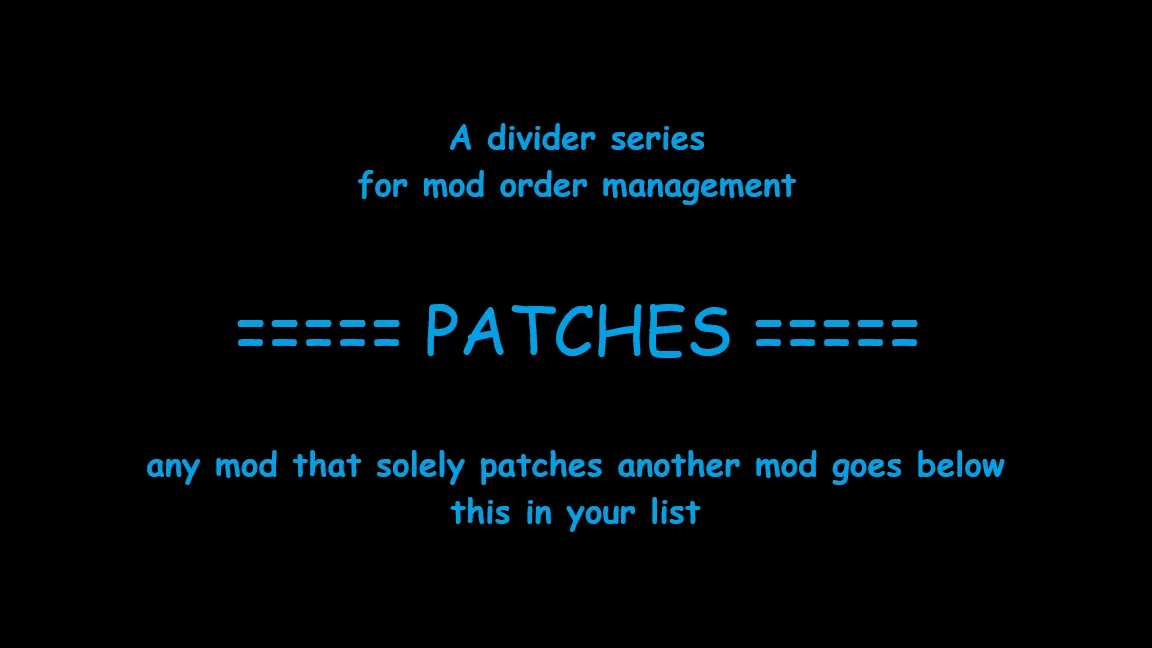 This mod is merely a divider with no code or game-altering effects. You place mods after it in your load order for the purpose of organization. This specific divider is meant for organizing mods whose sole purpose is to patch another mod, which are typically placed near the bottom of your load order.