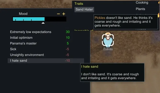 Pawns with this trait hate sand, giving them a mood debuff. It is now stage based so it depends on the situation.