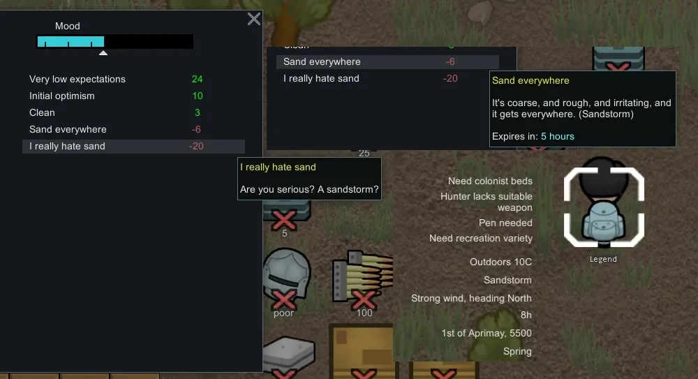 1st stage: (-5) Active when the pawn is near sand terrain or filth. If Sandstorms(1.5) or Odyssey(1.6) is installed it will also check the Sand Grid for this stage.